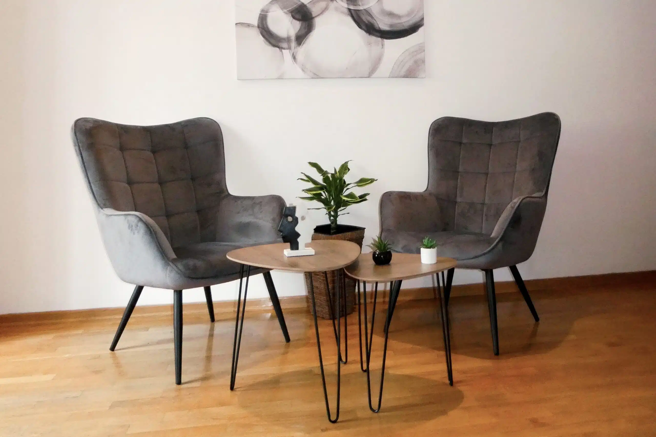 Dvije sive fotelje namijenjene klijentu i terapeutu tijekom savjetovanja i ostali detalji iz ureda.